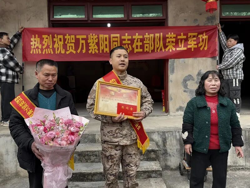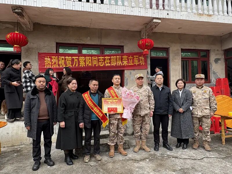 来到万紫阳家中,区人武部领导庄严宣读了立功喜报,为他佩戴了“荣立三等功”绶带,并将镶金喜报及慰问金送到家人手中,接过这份承载着奉献与荣誉的喜报,全家人脸上写满自豪与感动。