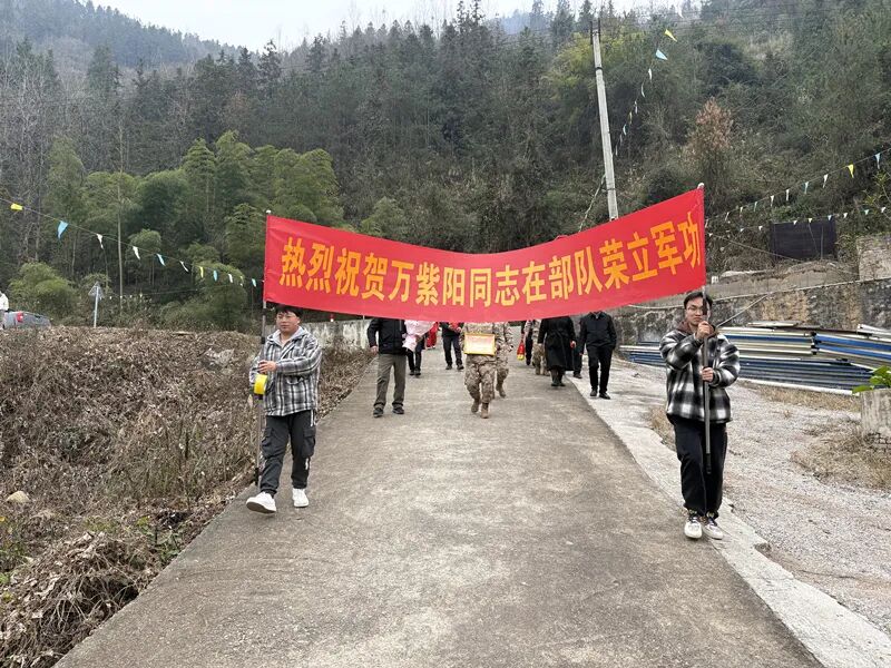 蜿蜒的乡村道路上,“热烈祝贺万紫阳同志在部队荣立军功”的红色横幅格外醒目。送喜队伍手持喜报,一路前行,引得沿途乡亲纷纷驻足围观,喜庆的氛围在山间村落里流淌。