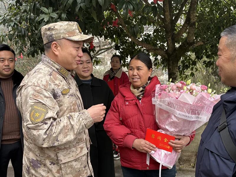 随后,慰问组一行还赶赴现役军人毛新家中,为其家属送上鲜花与慰问金,传递党和政府对军属的关怀与敬意。